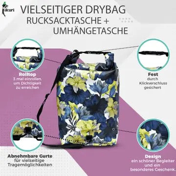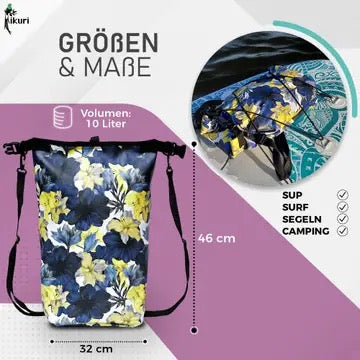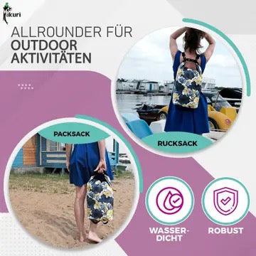 Dieser wasserdichte Beutel ist leicht, robust und platzsparend zusammenrollbar: er schützt Wertsachen, Smartphone und Kleidung bei Outdoor-Aktivitäten wie Stand up Paddling (SUP), Paddeln, Surfen, Segeln, Kanu, Angeln oder Wintersport wie Snowboarden und Skifahren. Auch im Urlaub oder auf Schulausflügen Deiner Kinder ist er ein praktischer Begleiter.Wenn der praktische Rolltop-Verschluss mindestens 3 mal eingerollt wurde, ist der Packsack wasserdicht und man kann den Verschluss als zusätzlichen Griff nutzen.Der innere Teil der Wassersporttasche ist mit einem Futterstoff verarbeitet. Eine kleine Extratasche für kleinere Utensilien wie Schlüssel oder Geld befindet sich griffbereit im Inneren der Tasche.Die abnehmbaren, längenverstellbaren Gurte bieten verschiedene Tragemöglichkeiten: der flexible Beutel kann mit zwei Trägern als Rucksack getragen werden oder mit einem Träger crossbody quer über den Oberkörper.