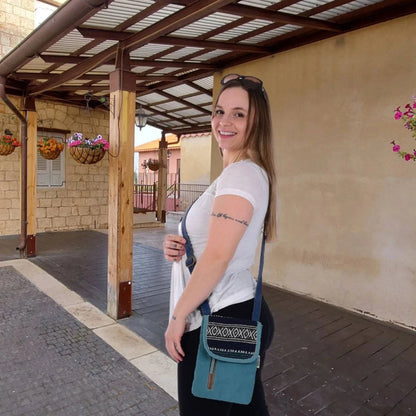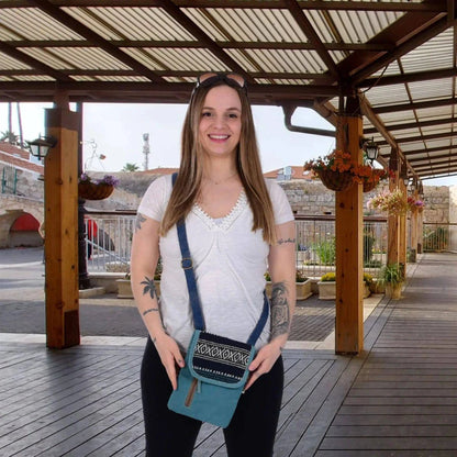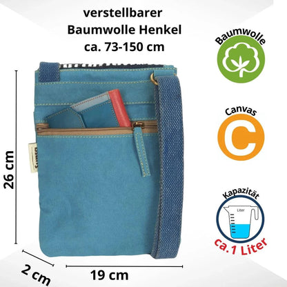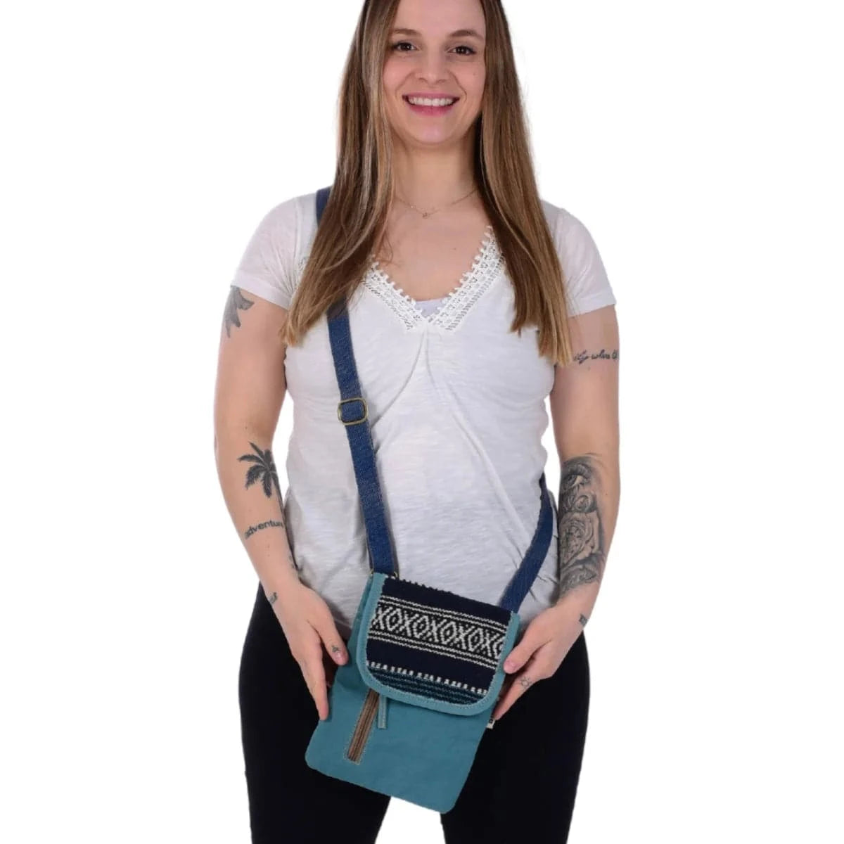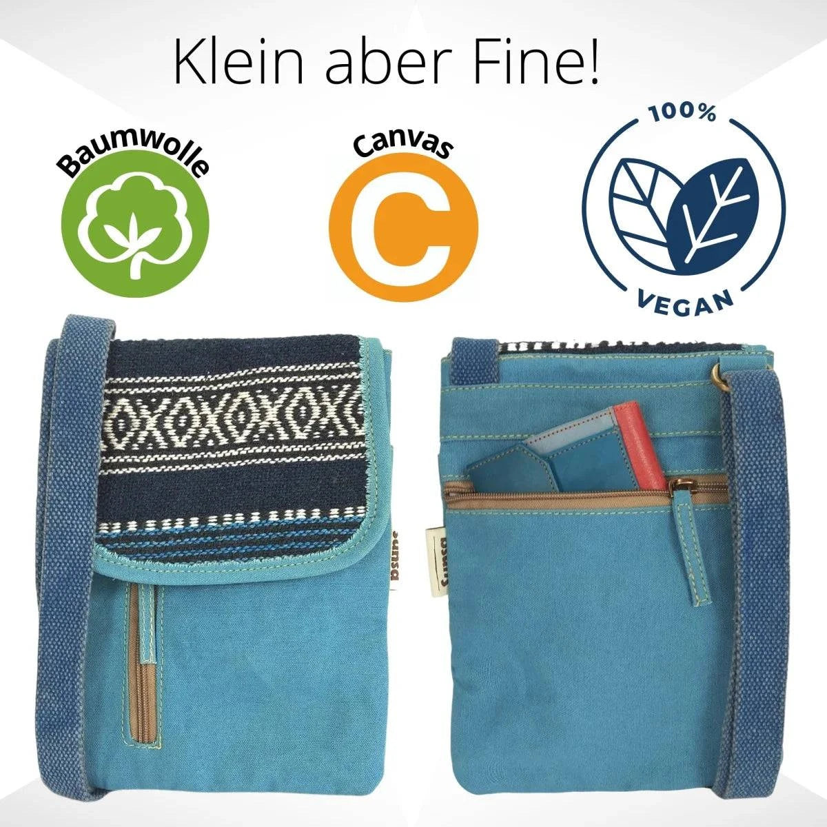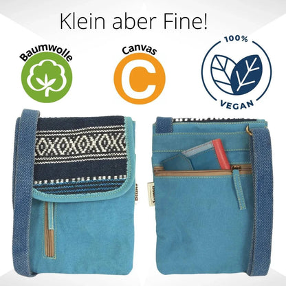 Damen Handy Tasche, kleine Umhängetasche aus Canvas & gewebte Baumwolle. Vegane Crossover bag mit Streifen türkis