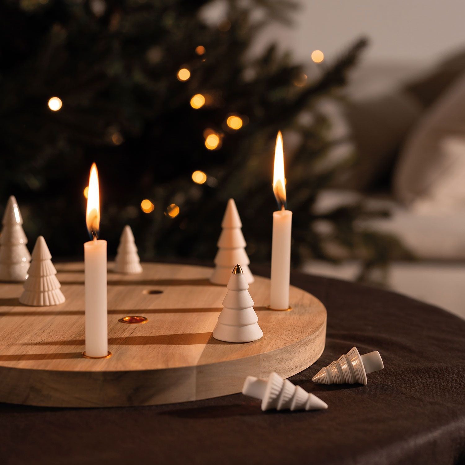 funkelndem Lametta und leuchtenden Kugeln. Kleine, reduzierte Bäume aus feinem Porzellan mit goldenem Dekor erzählen eine weihnachtliche Geschichte.